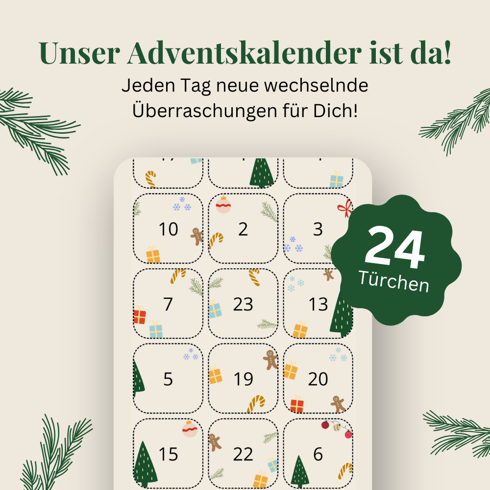 Vom 1. bis 24. Dezember erwartet dich hinter jedem Türchen eine neue, liebevoll ausgewählte Überraschung: exklusive Rabatte, Geschenke, Aktionen oder kleine Specials, die nur an diesem Tag verfügbar sind.