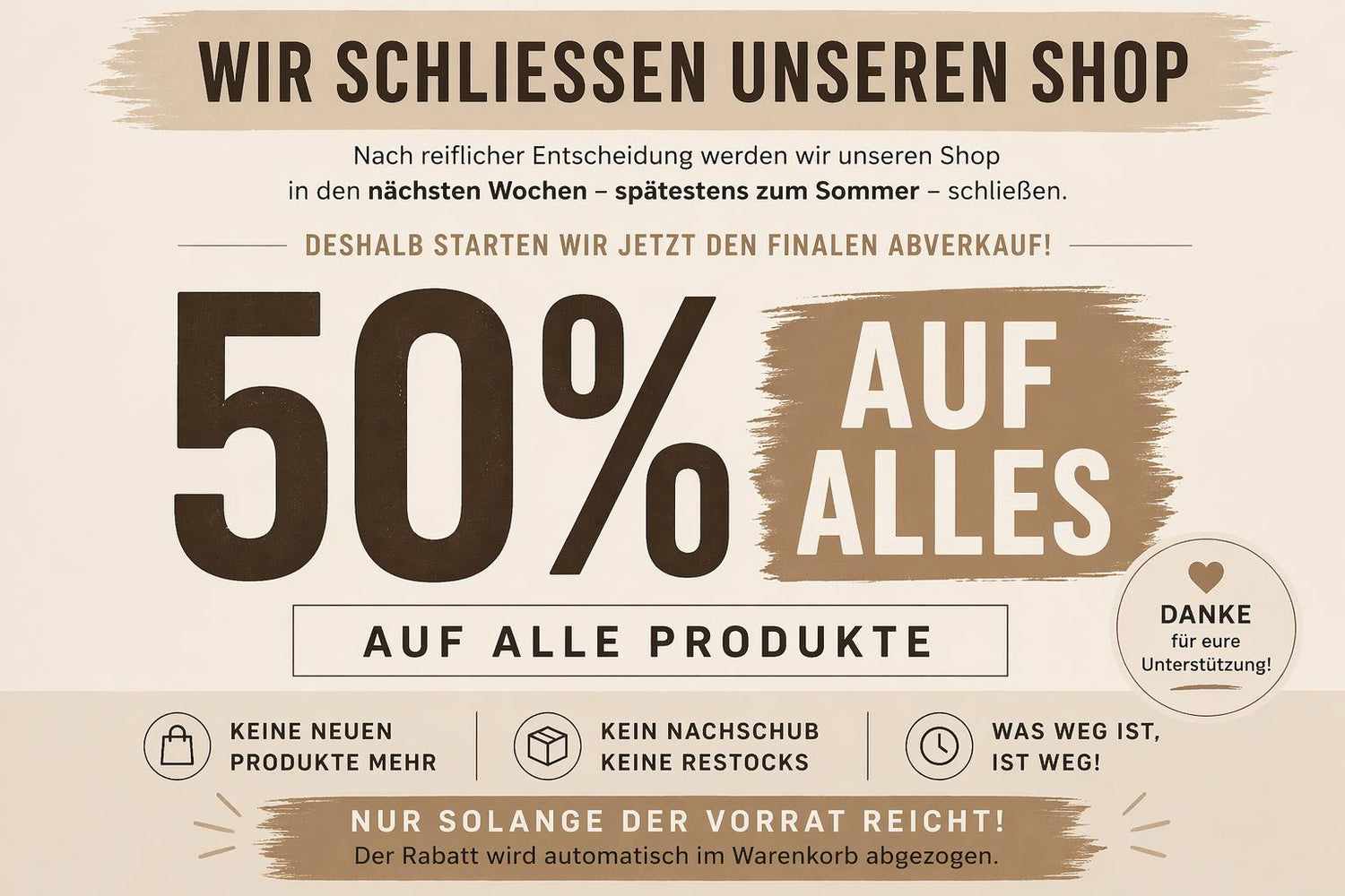 Nach reiflicher Entscheidung werden wir unseren Shop in den nächsten Wochen (spätestens zum Sommer) schließen.