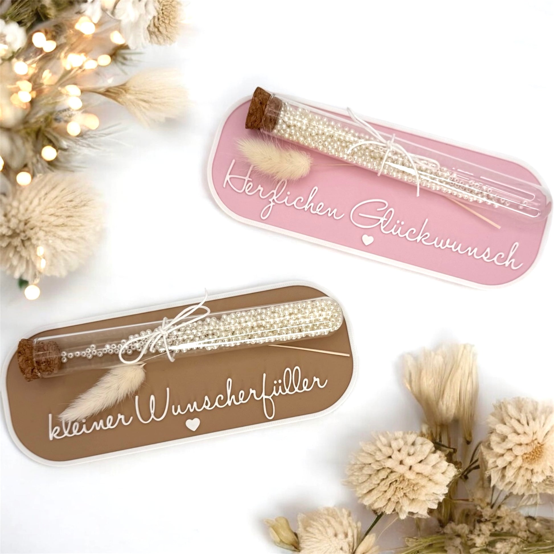 Diese Wunschfüller sind kleine, besondere Geschenkartikel mit großer Bedeutung. Die dekorativen Platten mit Schriftzügen wie „Herzlichen Glückwunsch“ oder „kleiner Wunschfüller“ werden durch ein Reagenzglas ergänzt, das sich ideal für persönliche Überraschungen eignet.