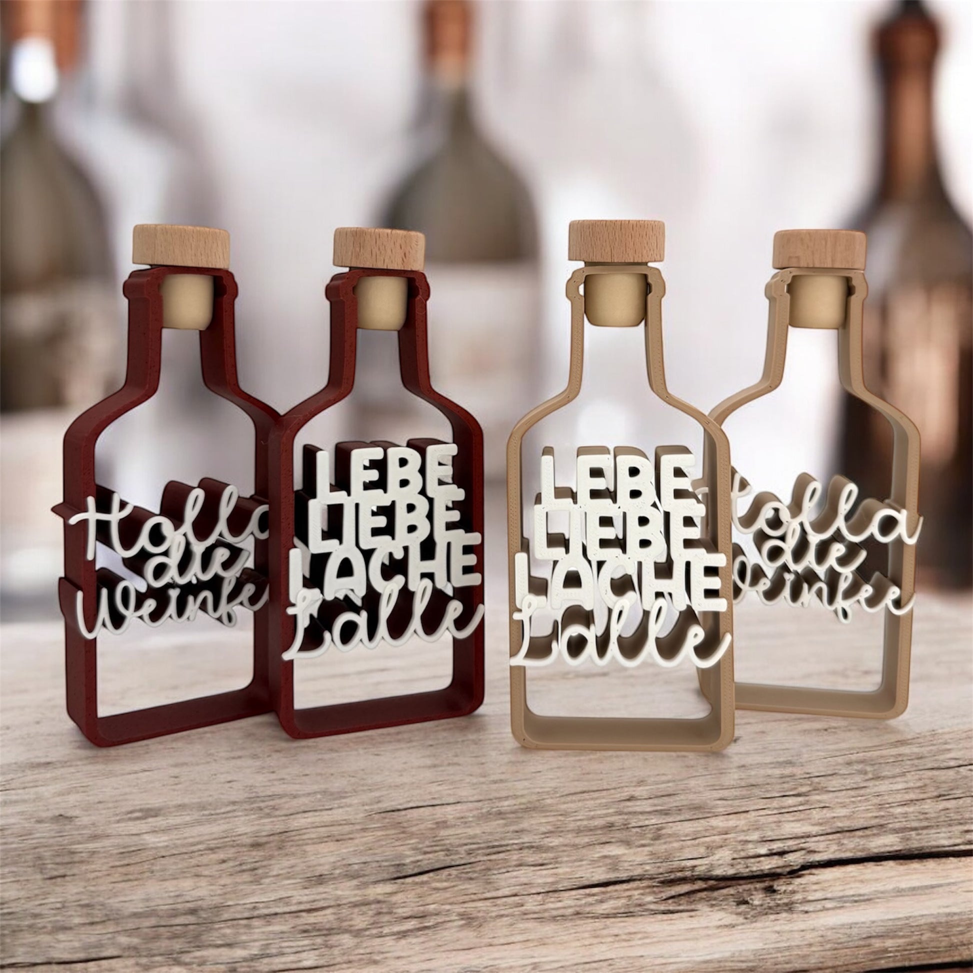 Diese dekorativen Flaschenaufsteller bringen Humor auf den Tisch und machen aus jeder Flasche einen echten Hingucker. Mit den Schriftzügen „Lebe Liebe Lalle“ und „Holla die Weinfee“ sorgen sie garantiert für ein Schmunzeln – perfekt für gesellige Abende, als Mitbringsel oder als kleines Geschenk mit Humor.